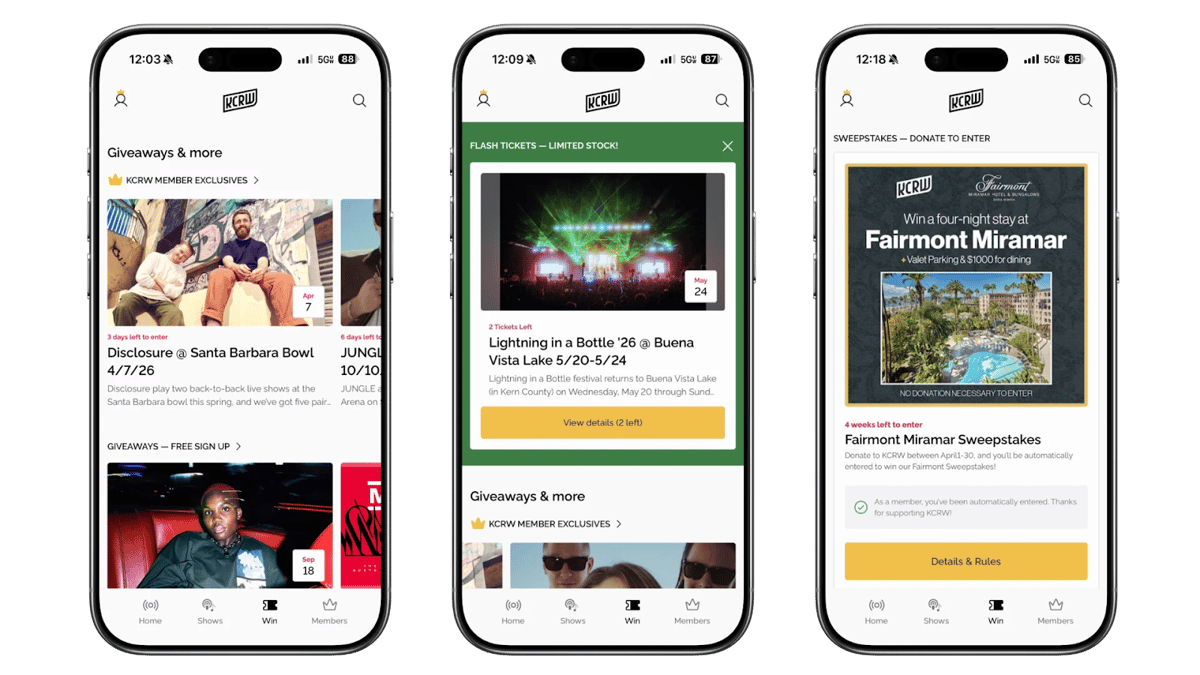 But first, we have a huge announcement regarding our KCRW App. Today, we released a new version of the app (7.3.0) with a new “Win” tab. Yes, it’s what you think it is: a place where you can win concert tickets, see our monthly sweepstakes prizes that you have a chance to win when you donate (monthly members are automatically entered to win every month), and plenty of member exclusives you get as a KCRW Member — like exclusive giveaways and first-come,first-served access to flash ticket drops for shows everyone wants to go to. Also, all members get a shorter 30-day wait until they’re eligible to win again, shortened from the usual 90-day wait. Check it out, new giveaways drop every day!